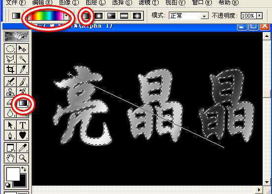2.按住“Ctrl”键,点击通道Alpha 1,调出该通道的选区,选择线性渐变工具,然后从字的左上角拉到右下角,出现如图1效果。