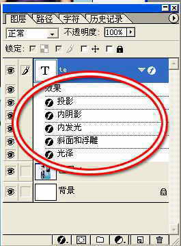 提示:当你对文字做完效果设置后,在图层面板中你会发现所有的效果设置都在这里显示出来(图3)。如你对哪种设置不满意,你可用鼠标双击相应的效果,再次进入到具体的参数设置中去调整。