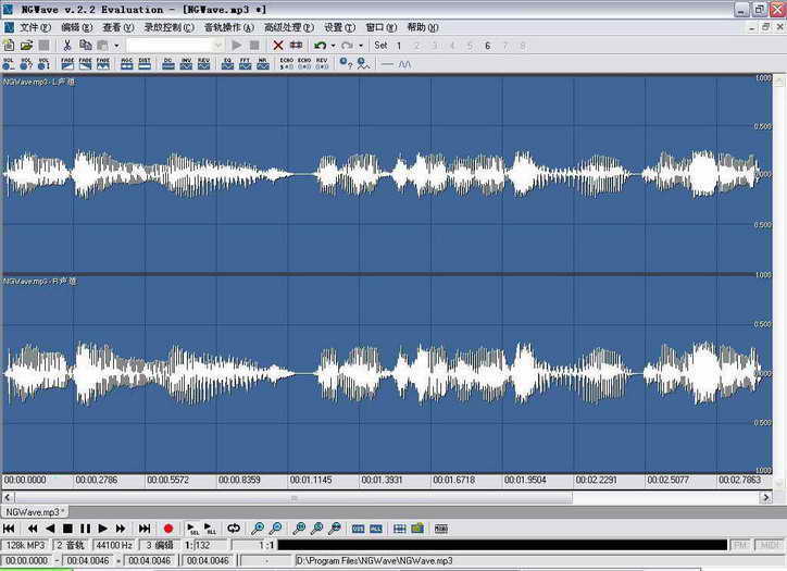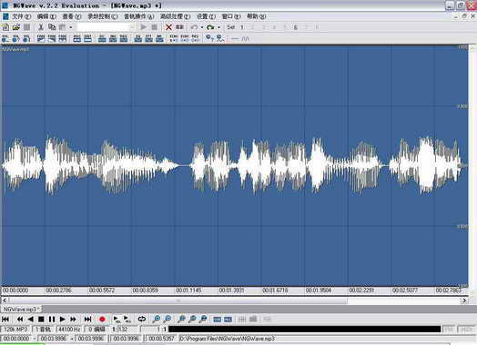 在软件的左下角有NGWave.mp3较为详细的信息:128Kbps的比特率,1个音轨,44100Hz的采样频率。从编辑窗口中的波形我们也不难发现这的确是一个单声道音频文件(图2)。