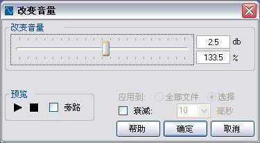 制造空间差:空间感的差异我们可以通过使左右两个声道的音量大小不同来营造。方法非常简单:按照上面的方法选中右声道音轨,选择“音轨操作→改变音量”,将“改变音量”滑杆拉至2.5dB(133.5%)即可。这时你会发现右声道的波形有轻微的拉伸,即幅值有所增大(图4),最终的音轨效果如图5所示。