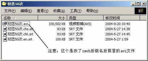假设我们需要添加字幕的影视文件名为“初恋50次.rmvb”,先将它重命名为“初恋50次.avi”,再将它和相应字幕文件(例如srt格式的简体中文/繁体中文/英文字幕)放在相同的目录下,然后分别将字幕文件重命名为“初恋50次.chs.srt、初恋50次.cht.srt、初恋50次.eng.srt”(sub格式的字幕文件可以同样处理),简单的两步,我们就完成了“偷梁换柱”的操作(见图1)。