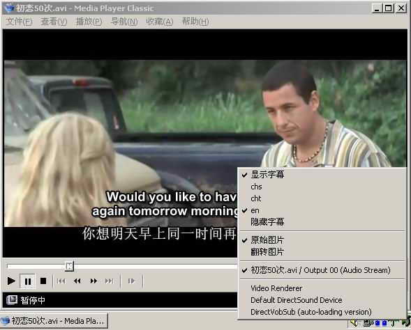 双击初恋50次.avi文件,MPC会自动加载VOBSUB显示字幕,此时任务栏将显示VOBSUB图标,字幕的切换、显示/隐藏、位置调整、同步调整等操作就可以通过右击VOBSUB图标“手到擒来”了^_^(见图2)。