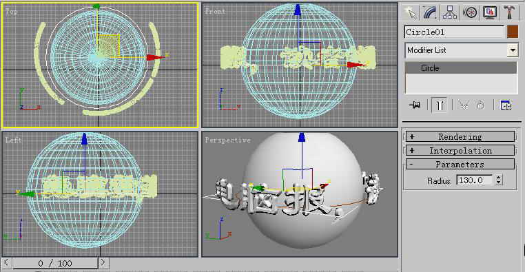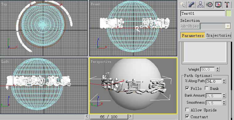 3.我们单击一下播放按钮,就可以在场景中看到文字对象环绕着球体开始运动了。但你会发现所看到文字是按照逆时针方向运动的。我们需要把文字对象的运动方向调整过来。马上单击“Auto Key”按钮,打开动画记录,将时间滑块放置到第一帧处,然后更改“Path Option”区域中的“%Along Path”参数值为100,接着将时间滑块放置到第100帧处,最后将“%Along Path”参数值设为0即可。关闭动画记录(图4)。