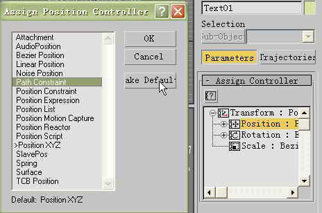 2.选中文字对象,然后进入到Motion(运动)命令面板中,展开“Assign Controller”(分配控制器)卷栏,选择“Position:Bezier Position”,接着单击左上角的“Assign Controller”按钮,在弹出的对话框中选择“Path Constraint(路径限制)控制器”(图2)。接着在出现的“Path Parameters”卷栏中单击“Add Path”按钮,并在场景中拾取圆形对象。此时文字已经限制到圆形上了,但文字的状态却改变了,这时你只要再勾选“Path Options”区域里的Follow选项,文字对象就会变成环球状(图3)。