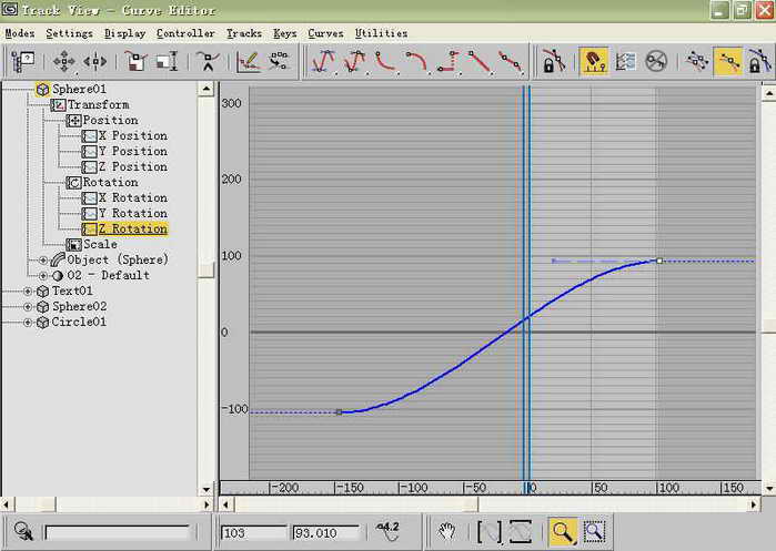1.选中地球对象,也就是选中“Sphere01”,即半径较大的那个球体。然后单击菜单栏中的“Graph Editors(图像编辑)→Track View→Curve Editor(轨迹视图)”命令,打开轨迹窗曲线编辑器。