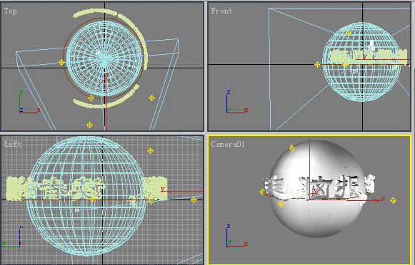 3.再切换到Top视图,点击一下播放按钮,大家可以看到文字对象和球体对象全部都运动起来了,并且球体对象的运动方向是自西向东,而文字对象的运动方向则与它相反。