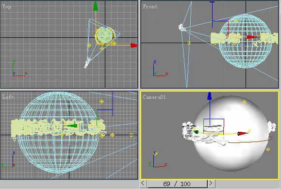 2.接下来我们在场景中建立一台摄像机。进入到“Create→Cameras”子命令面板中,单击Target按钮,在前视图中的适当位置上创建一个目标摄像机,并调整好摄像机的焦距,按C键将透视图转换为摄像机视图(图7)。
