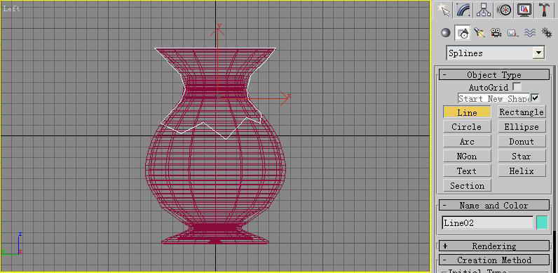2.下面我们就要狠下心将它打碎了。切换到Left视图,为了操作方面,我们将它设置为全屏。接着选择Line工具,然后沿着花瓶的上半部分描绘出一条闭合的曲线(图3)。