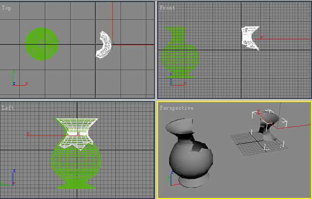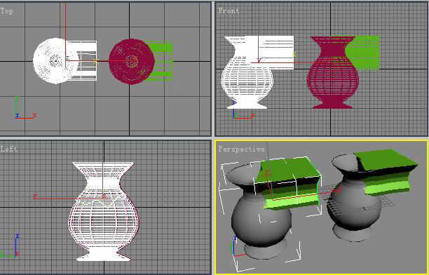 4.接着选中这两个物体,按“Ctrl+V”组合键将它们复制出一份,并将它们左右并排放置好(图5)。再单击左边的放样物体,然后单击Boolean按钮,在出现的Operation(操作)区域内选择第二个Subtraction,接着再单击“Pick Operand”按钮,最后点击场景中左侧的花瓶,就会得到一个有缺口的花瓶了。