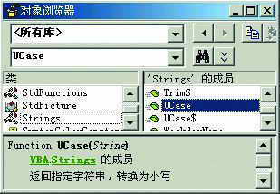 UCase函数明明是将一英文字符串转为大写,但在VB6.0的对象浏览器中却将UCase函数说成是“返回指定字符串,转换为小写”(如图所示)。而将一英文字符串转为小写的应该是LCase函数。