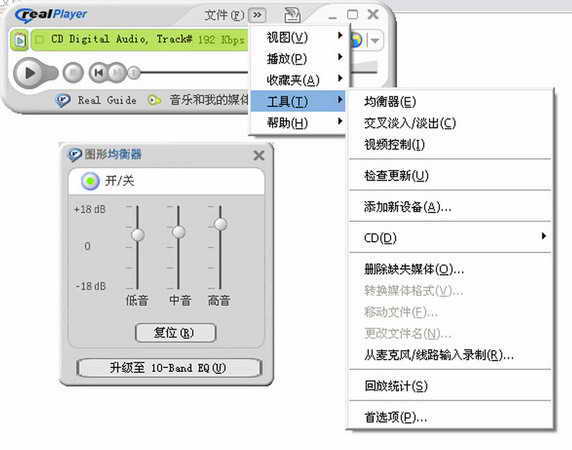 Real Player的均衡器默认是标准水平状态的,点击“工具→均衡器”,把高音和中音的调节滑块向上移动,就能有效地提高播放的声音(如图)。最多能比原来提高60%左右的音量,而且重要的是放大音量的同时,不会引起声音的失真。另外,升级了插件后,3道均衡可以变成10道均衡。