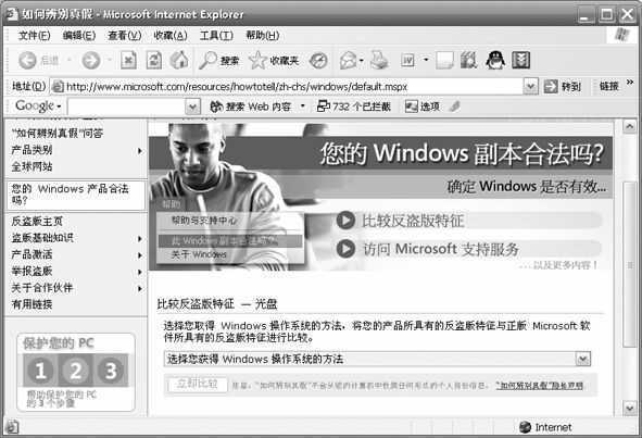 如果你在访问Windows下载页面时未接收到微软导航计划的提示,自己也无法确认自己的Windows是否通过了授权的正版软件,那么可以访问http://www.microsoft.com/resources/howtotell/zh-chs/windows/default.mspx页面来确认Windows的合法性。如图所示,在“比较反盗版特征→光盘”下拉列表框中选择获得Windows操作系统的方法即可验证。
