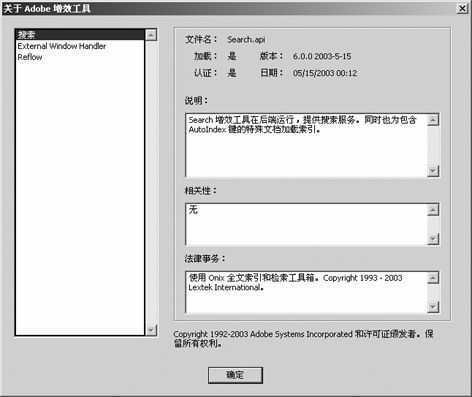 在Adobe Reader 6.0 的“帮助”菜单选择“关于Adobe增效工具”,可以看到已经加载了哪些插件,还有插件的功能说明、文件名。记住对应的文件名,然后到“Plug_ins”目录删除相应的API文件和CHS文件(中文版才有)即可。如图1,笔者只保留了搜索、重排页面、浏览器支持三个插件。保留插件对应的文件名如下: