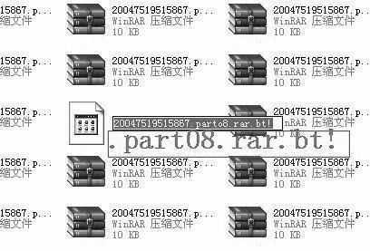 笔者打开下载文件所在的目录,发现里面是一系列的压缩包,而第8个文件没有下载完成,文件的后缀是“.part08.rar.bt!”(如图1)。