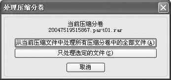 笔者首先选中第一个压缩包解压缩,在弹出的提示框中选择了“从当前压缩文件中处理所有压缩分卷中的全部文件”,如图2。解压开始,不过WinRAR又提示:必须有后缀为“.part08.rar”的文件才能继续解压!于是笔者把后缀为“.part08.rar.bt!”的文件重命名为“.part08.rar”,点击“确定”后居然可以继续解压了。不过高兴得太早,解压到99%时WinRAR又提示“压缩文件损坏”,然后解压工作就自动关闭了。