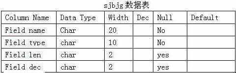 在PowerBuilder(文中简称PB)中,没有现成的像 VFP 中根据结构伸展文件生成数据表的函数。而在数据库应用系统的开发中,常常需要根据用户的要求创建数据表。我们可以仿照VFP的结构伸展文件创建一个数据表sjbjg(如图),用来存放用户欲创建数据表的结构,从而来相对简单地解决这个问题。