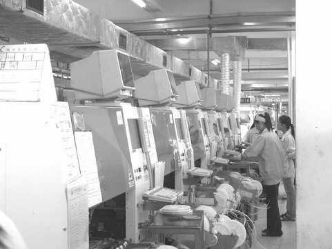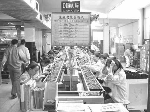 接下来这个环节就要安装DIP(单列直插封装)元件了。工人会将主板上的DIP元件手工安装到主板上,如:内存插槽、CPU插槽、AGP/PCI插槽、DIP电容及各种I/O接口等。