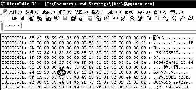 第三步,用UltraEdit读出第二步保存的new.rom,将00000070h行: 44 52 28 37 81 08...中的 81 改为 90(图1),然后保存为new.rom。顺便说一句,网上有朋友说00000080h行也必须改,其实00000080h行只是BIOS的标题,改不改都没有影响,所以最好不要改动,我就没有改。