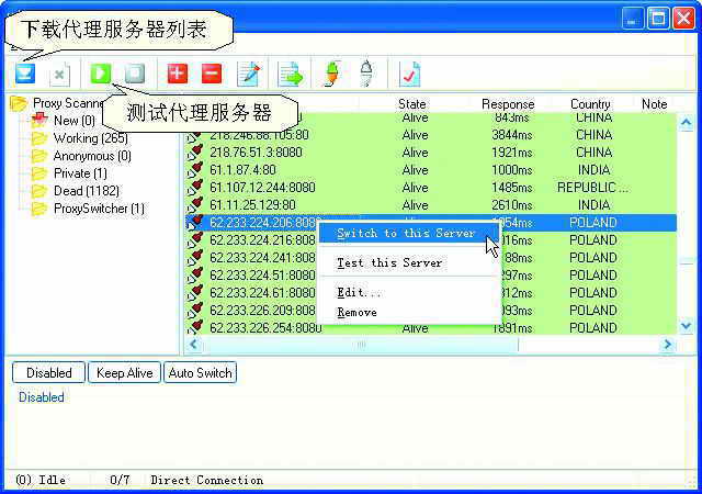 由于代理服务器存在很大的不稳定性,因此下载完毕后的代理服务器并不能保证都可以使用,我们还要对它们测试一下以确定其是否可用,按下绿色的“Test proxy servers for availibility”按钮,软件就会自动分析下载的代理服务器列表并会根据分析测试结果将列表中的代理服务器分别归纳到“Working、Anonymous、Private、Dead”四类目录中,我们可以使用的就是“Working”目录中的代理服务器了。