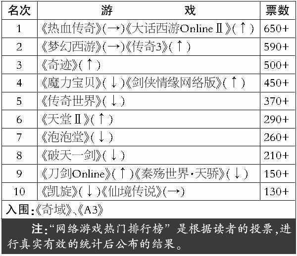 在众多忠实玩家的力挺之下,《大话西游OnlineⅡ》终于冲上去与《热血传奇》并列第一。实在是可喜可贺。《传奇3》回归第二,与《梦幻西游》平分秋色。《魔力宝贝》近期没有什么出色的表现,自然被《奇迹》夺走了第三。与《魔力宝贝》并列第四的是《剑侠情缘网络版》。《传奇世界》则下降到第五。