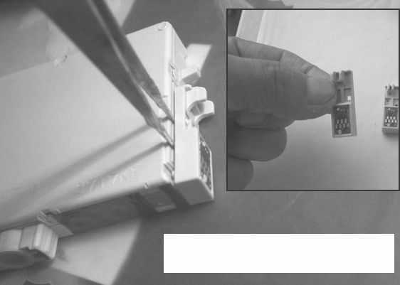 交换中把握这样几点:一是最好按黄、蓝、红顺序交换,也就是说最先是黑色和黄色墨盒相互交换,因为黄色用得最少;二是每个墨盒芯片或者墨盒芯片固定卡的位置是固定不变的,墨盒交换它却不能交换,所以交换墨盒时就得从墨盒上撬下来(图4)。