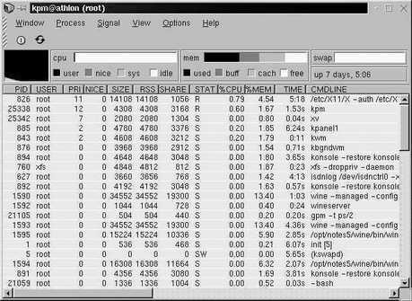 在图形界面下你只要运行命令kpm,就可以看到如图所示的任务管理器了。里面列出了当前进程的pid等一些情况,还可以看到CPU、内存和交换区的使用情况。