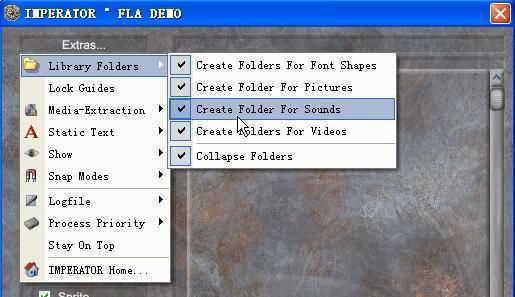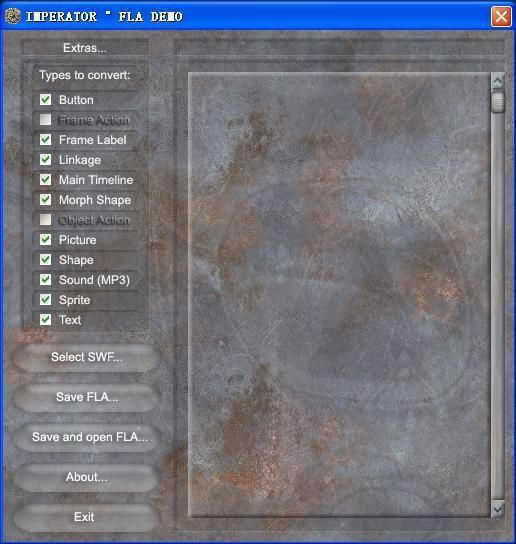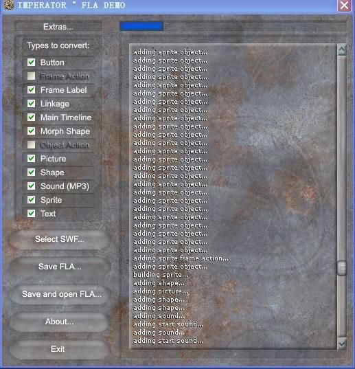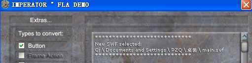 如果全部勾上了就会完整地把一个SWF文件里的图片、矢量图、声音、按钮等构成一个SWF文件的所有元素全部解析出来。如果你仅仅是想查看SWF文件的音频素材,就可以只勾上Sound(MP3),这样IMPERATOR °FLA就会有针对性地将你需要的东西解析出来,以加快解析的速度。