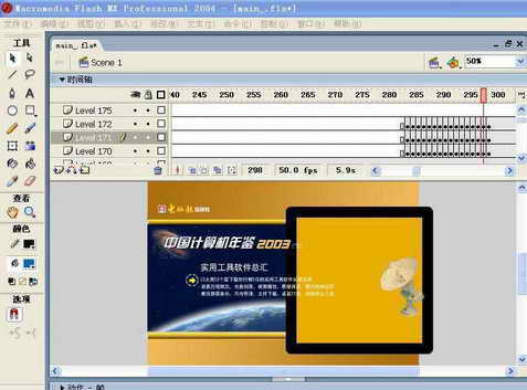 如果SWF文件不是很大的话,一般几分钟就可以搞定,转换完后,双击“main.fla”就可以打开转换后的文件,在这里每一层、每一帧都清清楚楚,每一个场景、每一个元件都不会少,与我们编辑的FLA格式文件很相似(图5)。