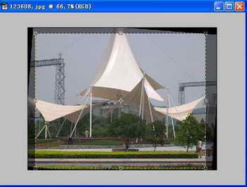 1.打开要调整的图片,先将画布扩大一点,以便后面的操作。选择工具箱中的裁剪工具,然后在照片中全选,将鼠标移到裁剪框外,旋转裁剪框,这里地面裁剪工具的边线与照片的地面尽量保持水平,如图1所示。调整好后,在裁剪框内双击鼠标即可裁剪。