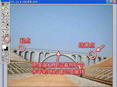 1.打开一张倾斜的照片,在照片中找一条比较水平的参照线,为了效果比较明显,我们就选一张水平线明显的桥梁照片。选择工具箱中的度量工具,然后再用度量工具沿着照片中水平的地方建立度量线,如图3所示。