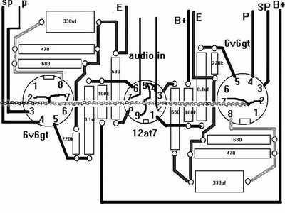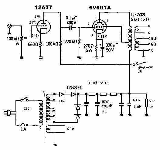 (5)如果电子管没有屏极发红,输出变压器没有嗡嗡响,再用万用表量量各点的电压,灯丝电压6.3V,B+应该降到了250V左右, 6V6GTA的3脚电压是230V左右,4脚电压在240V左右,330μF电容两端电压是11V左右,此时6V6GTA 的屏流在40mA,12AT7的1脚、6脚的电压应是80V左右,3脚、8脚是1V。