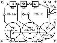 图2是我制作时的元件布线图。3个470Ω/11W的陶瓷电阻是立式安装的,便于散热。放大部分的线全部从电路板的一边出,以便安排整个电子管放大器的布局。