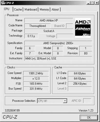 虽然目前的Sempron只有T-B核心(Model 8),但是在AMD提供的31994号白皮书中,详细地介绍了型号为Model 10(Barton核心和Thorton核心)的Sempron,所以首先要分析CPU的情况,笔者用CPU-Z分析了手中的Sempron,发现是T-B核心(Model 8),针对T-B核心主要是修改L3。因为Sempron的L1都是完全闭合的,所以我们直接对L3进行如下操作。