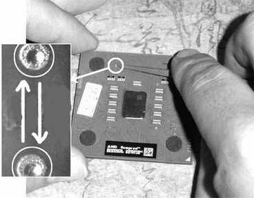 要破解Sempron的新基板,大家必须要将CPU表面挖开。用小号三棱钢锉,在图2的两个圆圈之间稍微用力来回打磨,直到磨开有机玻璃的表面看到下面隐藏的铜桥为止。