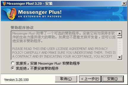 提示:在安装Messenger Plus!出现“赞助程序协议”对话框时,一定要点选“我拒绝,不要安装赞助程序”选项(图2),否则你的IE浏览器上就会出现一个挥之不去的插件工具条,非常麻烦。