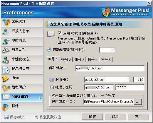 MSN可以自动接收到Hotmail的邮件通知,由于有了这一功能,第一时间就能看到一些重要的电子邮件。但是对于一些非Hotmail的邮件,MSN是否也能收到它们的邮件通知呢?利用Messenger Plus!可以让MSN实现接收到五个非Hotmail邮箱的邮件通知,在此以MSN接收来自163.com的邮件通知为例。