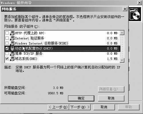 在Windows 2003服务器中,依次点击“开始→设置→控制面板”,运行“添加或删除程序”,在弹出的窗口中切换到“添加/删除Windows组件”页。接着在“Windows组件向导”对话框中选中“网络服务”选项,点击下方的“详细信息”按钮。在弹出的“网络服务”对话框中选择“动态主机配置协议(DHCP)”选项后(图1),点击“确定”按钮。然后在“Windows组件向导”对话框中点击“下一步”按钮,开始配置、安装DHCP服务,最后点击“完成”按钮即可。