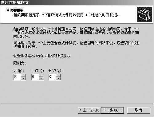 在“添加排除”对话框中指定在作用域中你想排除的IP地址范围,如果没有,可直接点击“下一步”按钮。接着配置“租约期限”,在这里无法将期限值设置为“无限制”,因此暂时使用默认值“8天”(图3)。在“配置DHCP选项”对话框中一定要选择“是,我想现在配置这些选项”,点击“下一步”按钮后,配置默认网关和DNS服务器,最后点击“完成”按钮即可。