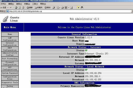 Coyote Linux可以实现Web管理(路由器自定义的端口为8180,你进入后可以更改),如笔者路由器管理为:http://192.168.42.254:8180 输入用户名Root和刚才设置的密码进入管理页面(注意第一次仍要将启动软盘放入路由器中,并打开写保护,以便保存配置)(图2)。