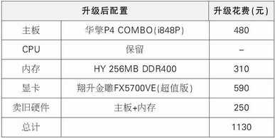 推荐理由:预算只有一千元,P4 1.7GHz CPU肯定不能换。将主板升级为i848P芯片的华擎P4 COMBO主板,它采用了Socket 478/LGA775 双插槽设计,能兼容LGA775处理器。主板虽然是Micro-ATX结构,但提供了4个PCI插槽、1个AGP 8×插槽、2个DIMM插槽,扩展性能良好。并拥有6个USB 2.0接口、2个ATA100和2个SATA接口。主板还集成CMI9739A音效芯片和RTL 8201网卡。内存至少得升级为256MB,i848P支持DDR400,现在DDR400与DDR333差价也不大,索性换一根256MB DDR400内存。显卡我向你推荐翔升金雕FX5700VE(超值版),它采用GeForce FX5700VE芯片,性能接近FX5700LE。显卡配备了8颗TSOP封装三星4ns DDR显存,容量128MB,位宽128bit,核心/显存频率为250/400MHz,DVI/S-Video/VGA接口齐全,确实非常超值。在扣除处理掉的主板和内存的钱后,升级总价为1100多,超出预算不多。