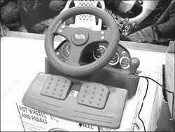 风火轮(Hot Wheels) 是世界第一大玩具车制造商美泰旗下的一个知名玩具品牌,其玩具车系列已经成为速度与激烈竞赛的象征,这次它把触角伸到了电脑游戏方向盘领域上。这款风火轮USB游戏方向盘采用了与真实F1赛车相近的尺寸,盘面直径为254mm的方向盘,还设计有一个手动排挡,上面有两个挡位;方向盘上按键并不多,只在正面设有4个可编程的按钮;由于不支持模拟/数字模式的切换,只能工作在模拟模式下,所以方向盘上也没有方向键,想用它来玩其他非赛车类游戏基本不太可能;底部设计有4个大口径的吸盘。不过我们已经不能要求太多,毕竟它只有其他低端产品售价的一半。从其外形和各种参数指标来看,该产品更像是一个玩具类的游戏方向盘,比较适合初级玩家购买。