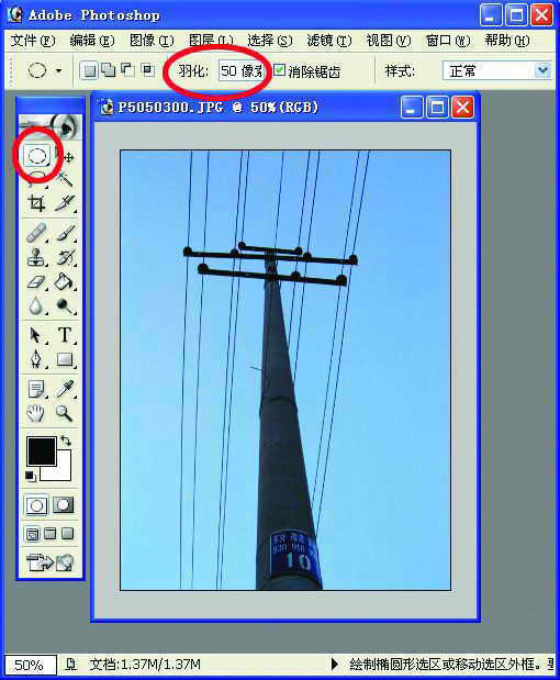 步骤一:在Photoshop中打开图片,选择椭圆选框工具,并将羽化度设为50像素(图1),羽化的目的是为了暗角的过渡更缓和。