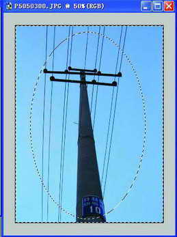 步骤二:用椭圆选框工具在图片上画一个椭圆的选择区,然后用CTRL+SHIFT+I 进行反选(图2),选择椭圆之外的区域,也就是将会产生暗角的区域;