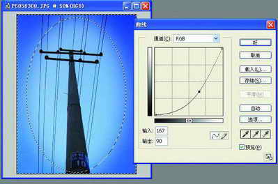 步骤三:选择合适的区域后,CTRL+M调出曲线菜单,将中间的线向下拉,这时看到随着线条的拉动,被选区域的颜色会变深(图3),步骤一中设置的羽化值将使暗角的过渡更缓和。对比效果见图4。
