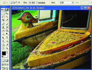 步骤一:打开图片,选择椭圆选框工具,并将羽化度设为80像素,并选取相应的区域(图5);