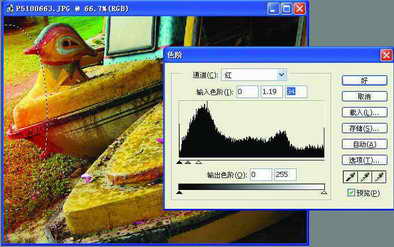 步骤二:按CTRL+L调出色阶调整菜单,选择红通道,将色阶的调整滑块向左拖动,这时被选区域的颜色会变得偏红,好像相机漏光一样(图6)。对比效果见图7。