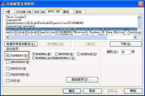 在Windows XP中,关闭所有打开的程序,依次打开“开始→运行”,将出现“运行”对话框,键入“msconfig”并单击“确定”。 在出现的“系统配置实用程序”界面中打开“BOOT.INI”选项卡,选中“/SAFEBOOT”选项,然后单击“确定”。将提示重新启动计算机。单击“重新启动”。这样电脑就将以安全模式重新启动(如图)。