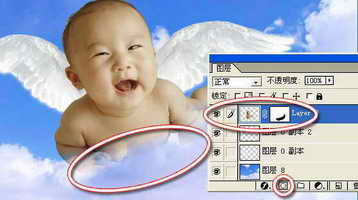 第四步,遮挡的技术。本实例的第一张图片是以云层来遮挡,这就需要利用遮罩的技术来实现。先将有云层的背景图片拖放进来,然后在图层面板中将人物图层激活,点图层面板下面的快速遮罩按钮,建立一个带有遮罩的图层。接着将工具面板中的前景色设置为黑色,选取毛笔工具,将笔头设置为一个合适大小的柔边笔头。在需要遮挡的部位小心涂抹,被涂抹的部位就很自然地消退了(图4)。