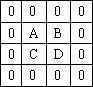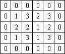 在具体编程时,假设开始图案为下面的矩阵,在4×3的矩阵图中有3种不同图案。先在外层套上一圈0(如表2)