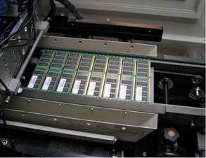 由于内存模组是以连板的形式生产的,因此,打标后的连板内存模组必须通过自动裁板机分割成单一的内存模组,即我们平常看到的单根内存条。
